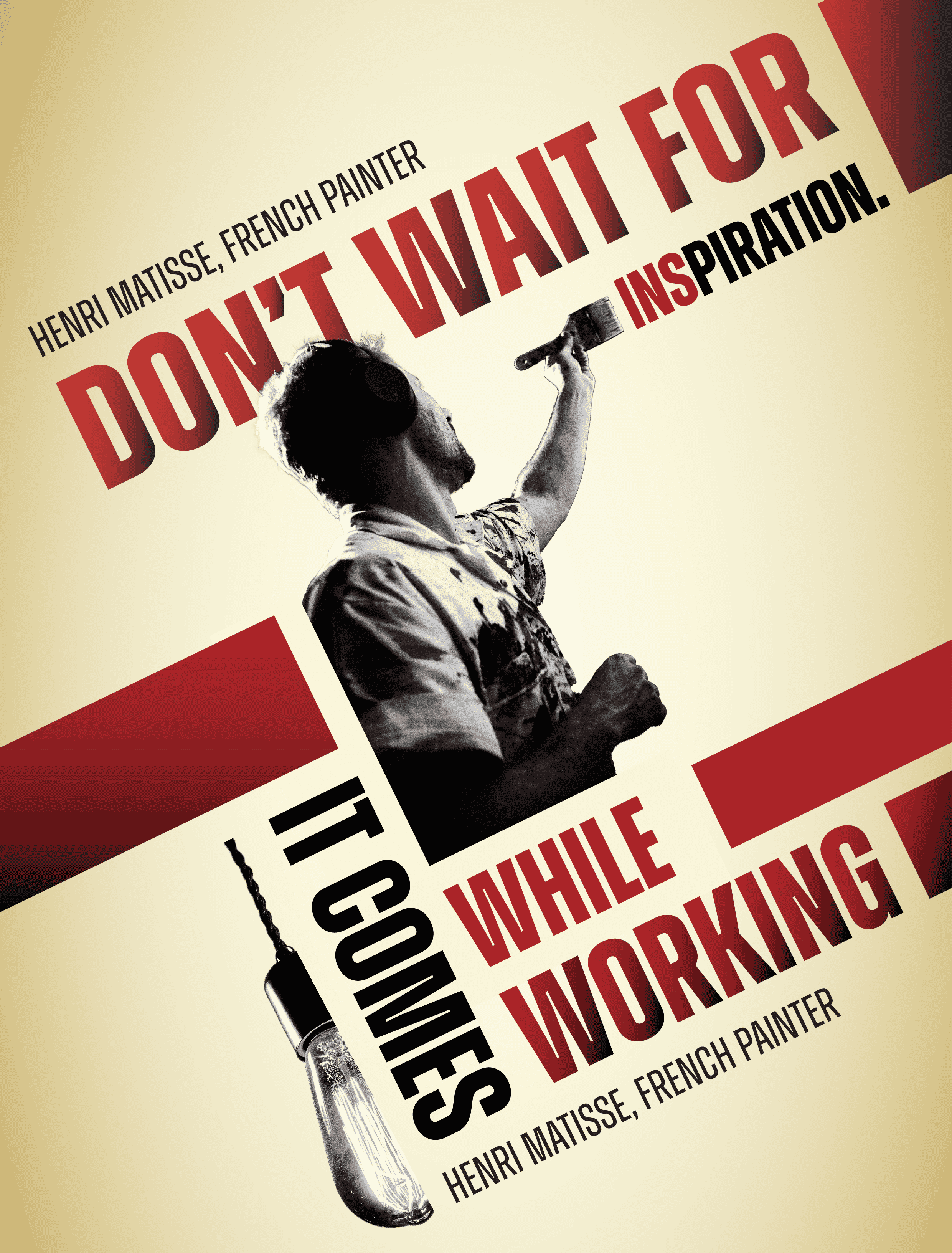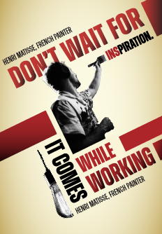 This poster takes inspiration from the Constructivism art movement, characterized by bold geometric shapes, diagonal layouts, and strong contrasts. Featuring a motivational quote by Henri Matisse. The dynamic composition, combined with red and black accents, highlights the urgency of action and reflects the Constructivist principle of merging art with purpose.